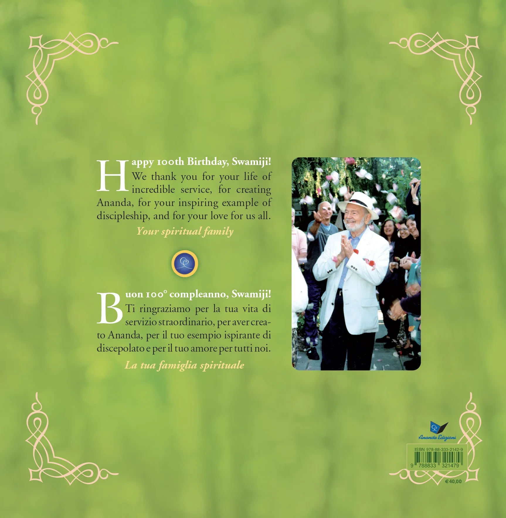 In occasione del centesimo anniversario della nascita di Swami Kriyananda, abbiamo voluto rendergli omaggio dal profondo del cuore, realizzando questo prezioso libro fotografico che racconta la sua vita. Swami è presente nel cuore di tutti coloro che l’hanno conosciuto e anche nel cuore di coloro che non sono riusciti a incontrarlo fisicamente, ma che si sentono egualmente sostenuti dal suo infinito amore. Leggendo questo libro, scoprirai alcune delle tappe fondamentali della vita di Swami Kriyananda, una vita dedicata anche a te: alla tua crescita, alla tua evoluzione e alla tua realizzazione del Sé. Infatti, dal Cielo, questo è ciò che lui vede anche in te: