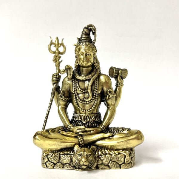 Questa raffinata statuina in ottone, proveniente dall’India e frutto di antica tradizione artigiana, raffigura il potente Signore Shiva, il primo Yogi, Dio nell’aspetto di dissolutore dell’universo e dei nostri attaccamenti e illusioni, con tutti i simboli che tradizionalmente lo caratterizzano: la posizione del loto su una pelle di tigre, il Tridente (Trishul), il tamburo (Damaru), il serpente, le collane di semi di rudraksha, i capelli raccolti da cui scorre il fiume Gange e infine l’occhio spirituale aperto al centro della fronte e la luna sulla cima del capo, a rappresentare la sua completa immersione nello Spirito Infinito.