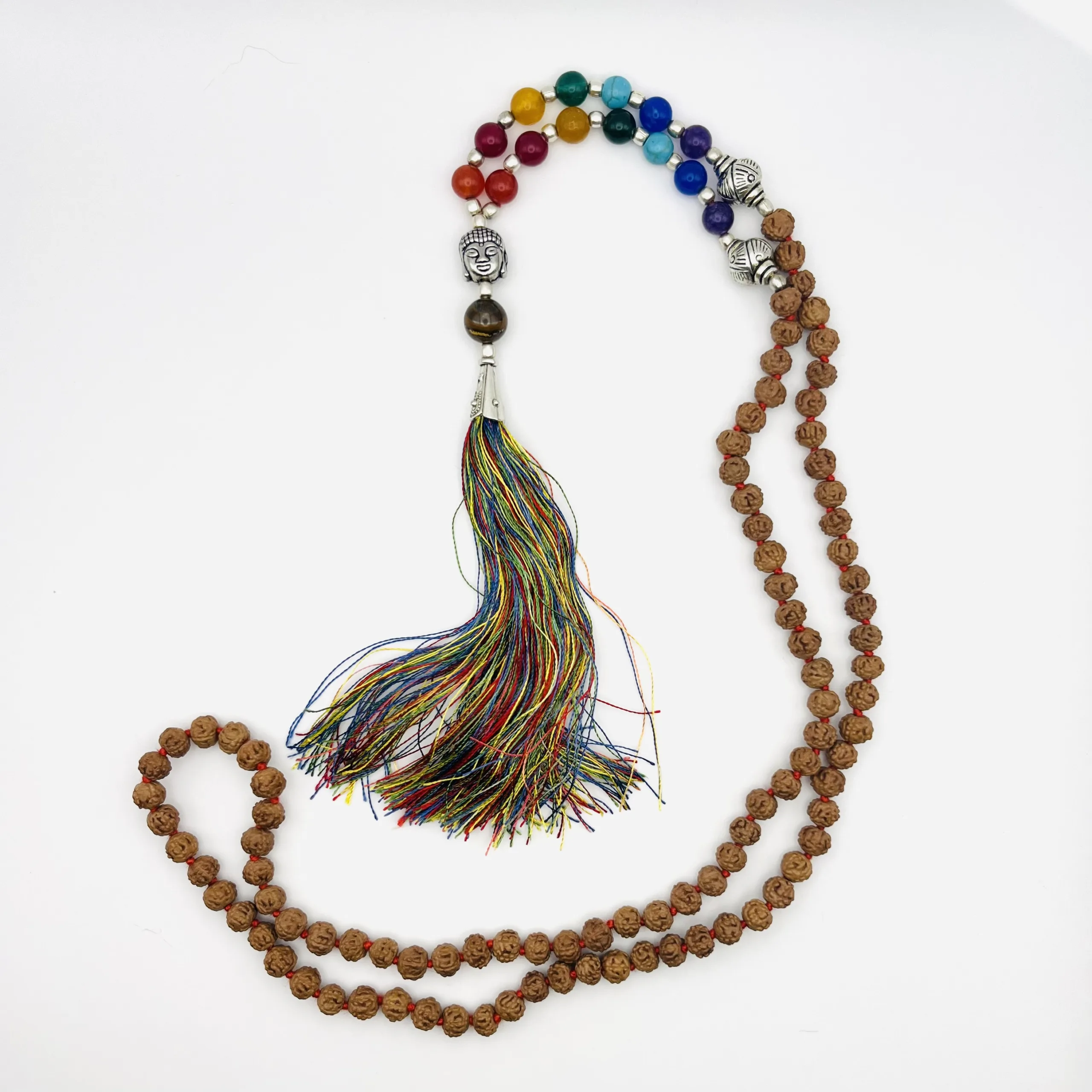 Chiude il mala una testa del Buddha, simbolo del risveglio interiore, una guru-bean di occhio di tigre, simbolo di forza, coraggio e invulnerabilità e una splendida nappa multicolore.