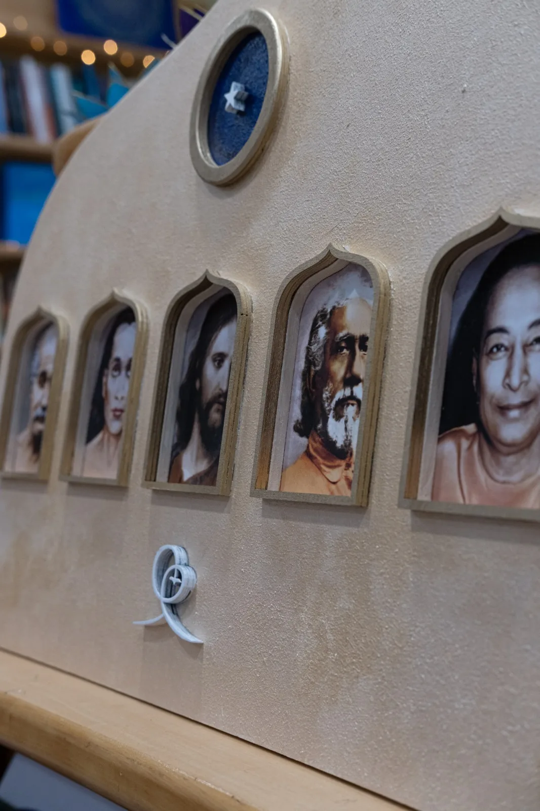 Questo altare devozionale è stato creato e decorato a mano dei membri della comunità di Ananda Assisi. Può essere appeso al muro con un gancio presente sul retro, oppure può